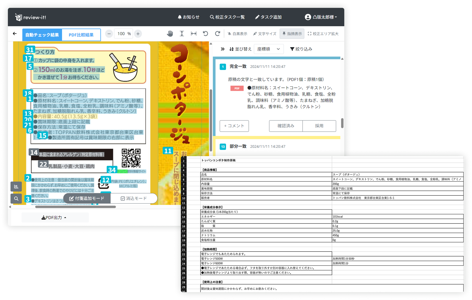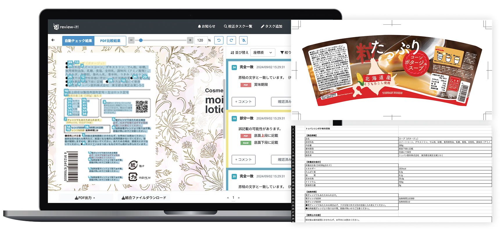 デザインデータと原稿を用意するだけで、review-it!が自動で照合。原稿との不整合を検出します。もう読み合わせに時間を費やす必要はありません。見落としのリスクをなくし、確認時間と心理的負担を大幅に削減します。