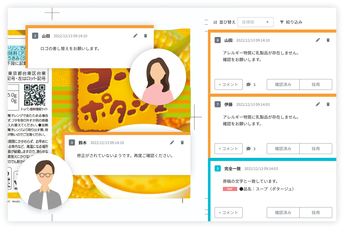 印刷やメールでの受け渡しはもう不要。ブラウザ上で複数人が同時に赤入れでき、確認フロー全体がスピードアップ。