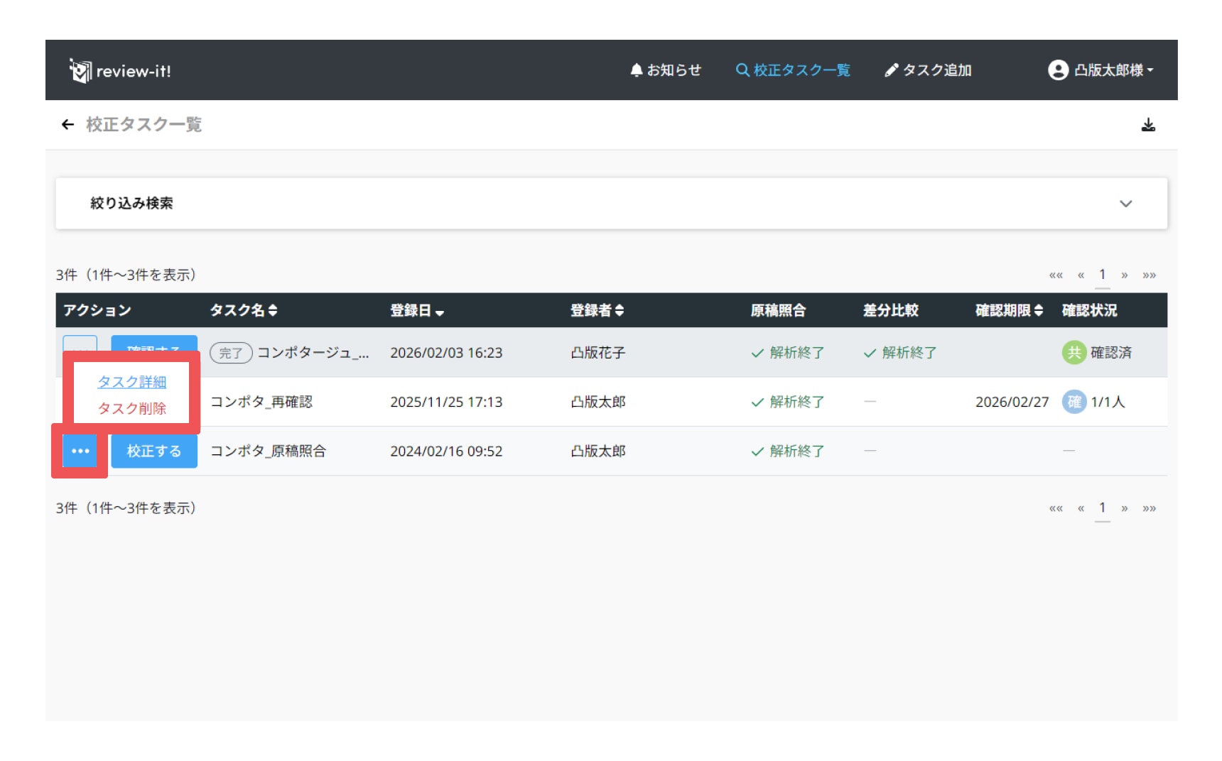 校正タスク詳細画面では、登録したタスクの情報の確認や変更をすることができます。