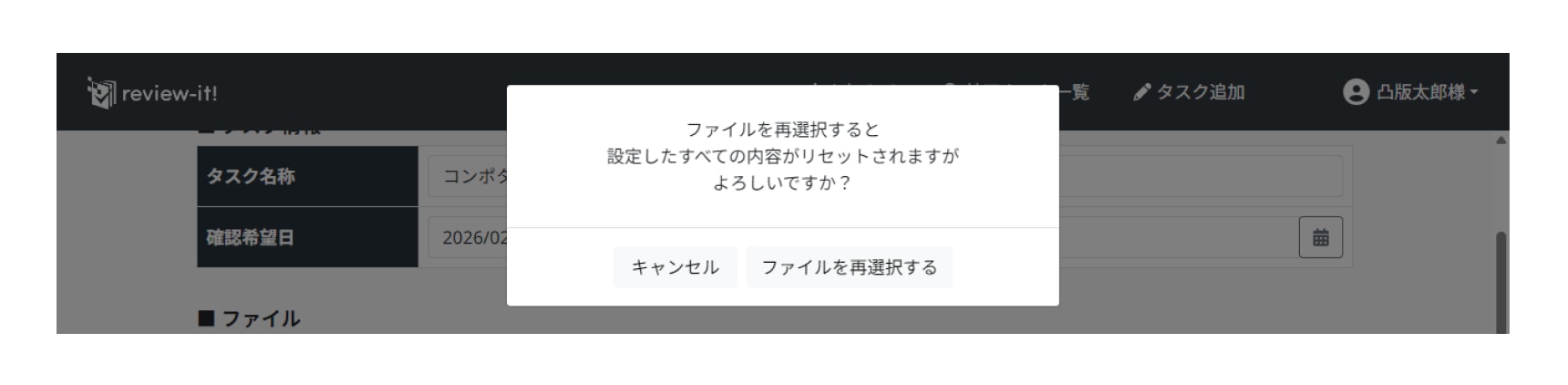 ファイルを選択すると、タスク編集画面の「比較対象PDF」の内容が変更後のファイル名に差し替わります。