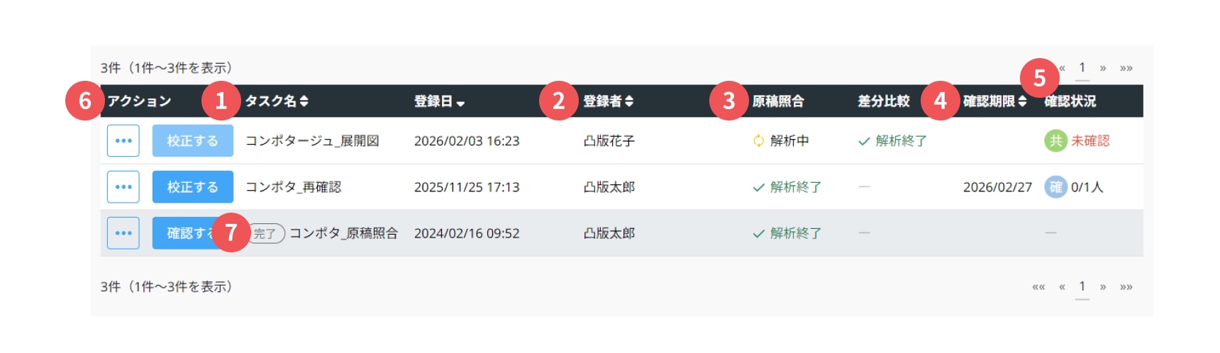 校正タスク一覧画面では自身が追加したタスクの解析状況や共同確認者の作業状況、自身が作業をしなければならないタスクを知ることができます。