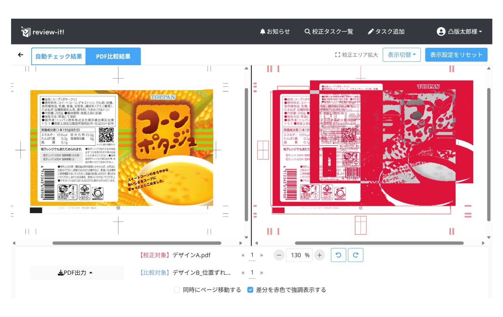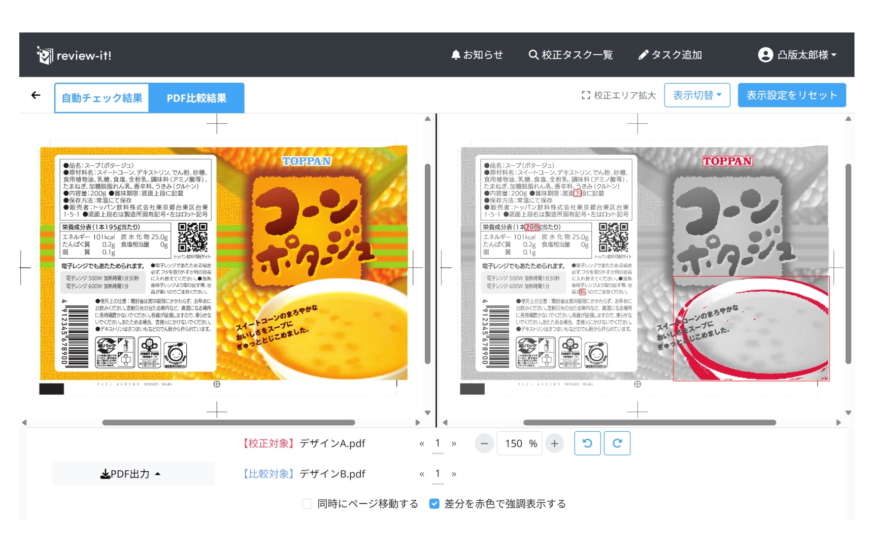 また、パッケージ描画サイズが一致していれば全ページで同じページ数ごとに自動の位置合わせが行われ、強調表示の結果を表示します。