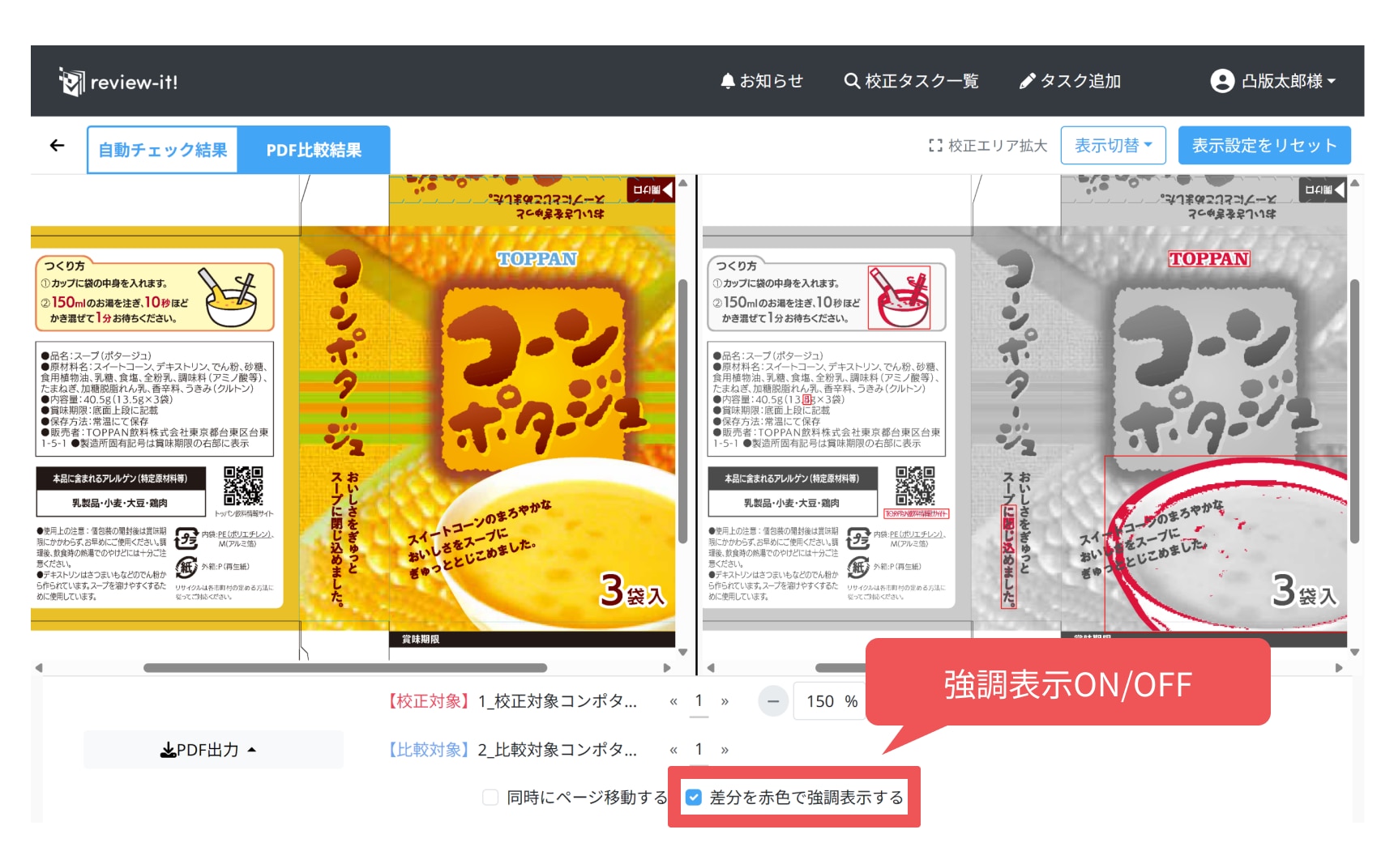また画面下部の『差分を赤色で強調表示する』ボタンにチェックを入れると、差異のある箇所を赤枠で囲んで表示します(デフォルトでON)。