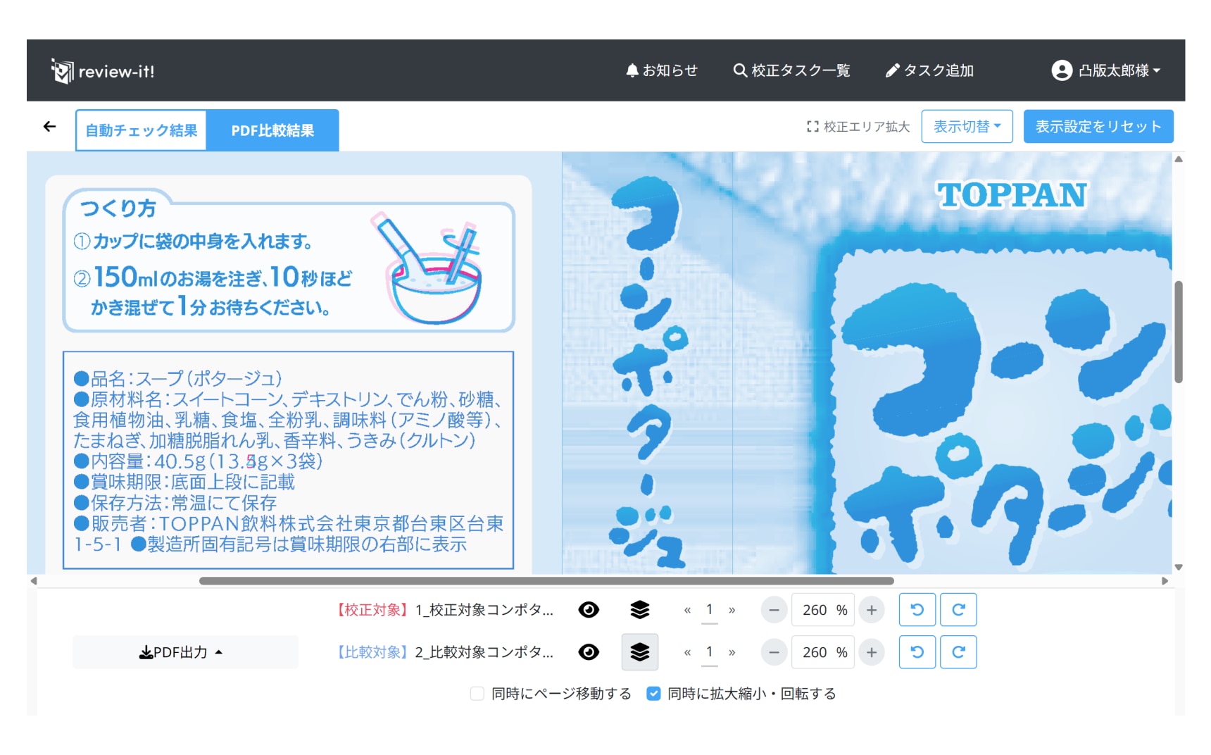 校正対象と比較対象のPDFを横に並べて比較します。
