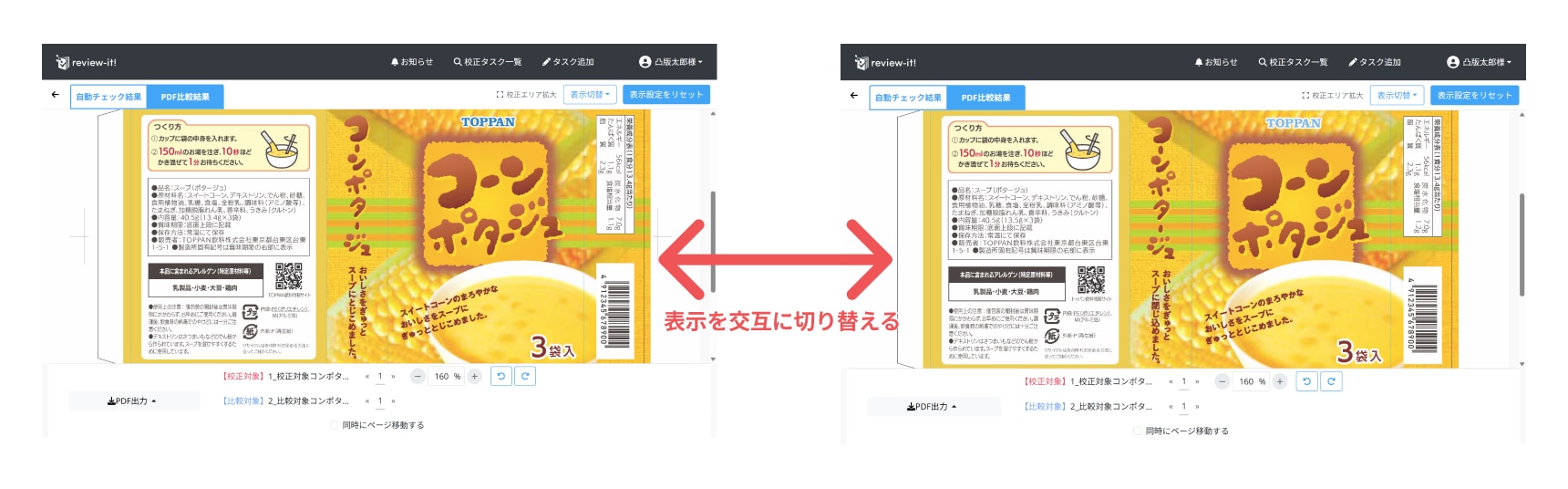 あおり検版を画面上で行えます。校正対象と比較対象のPDFを交互に自動で表示します。