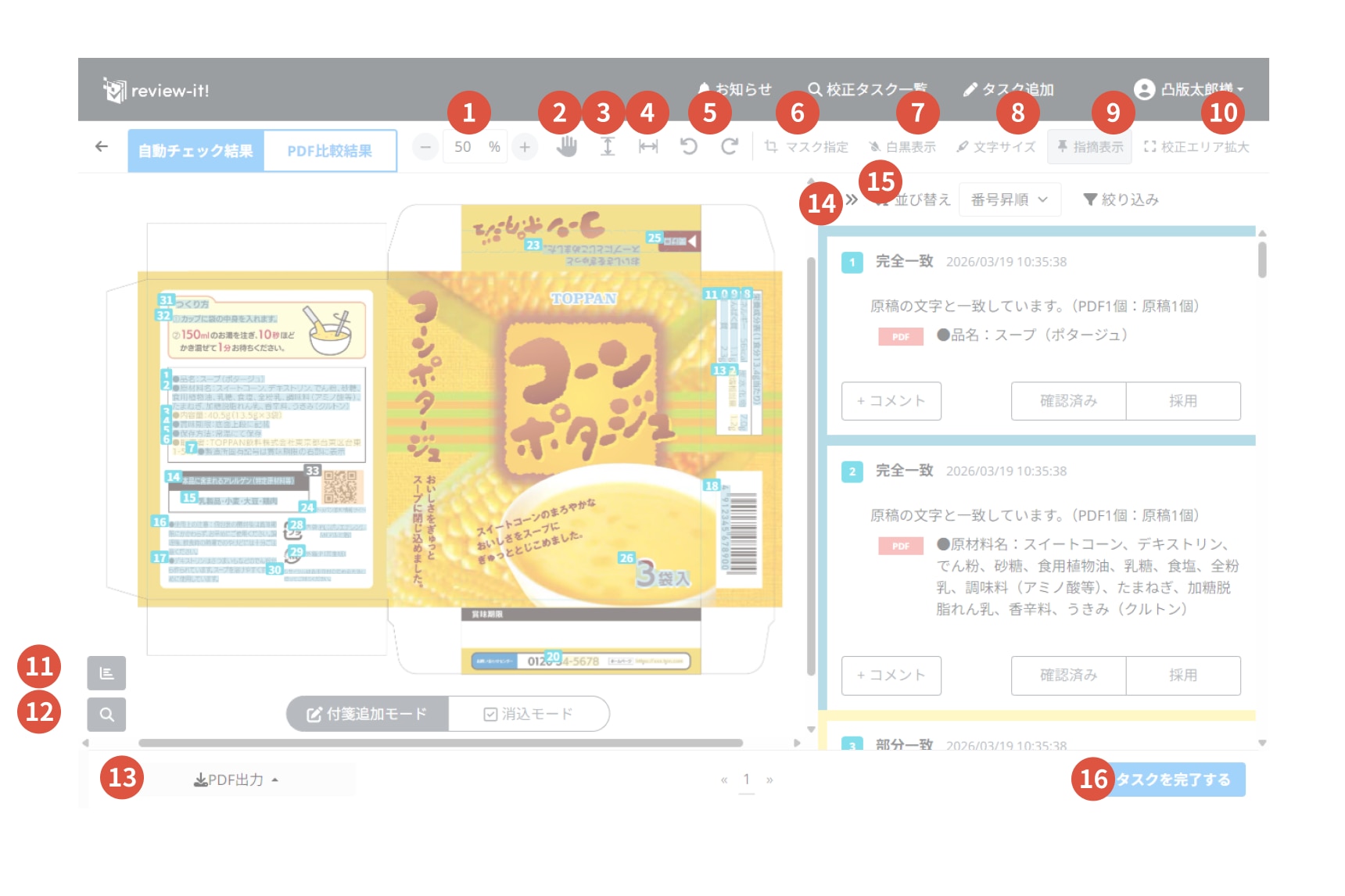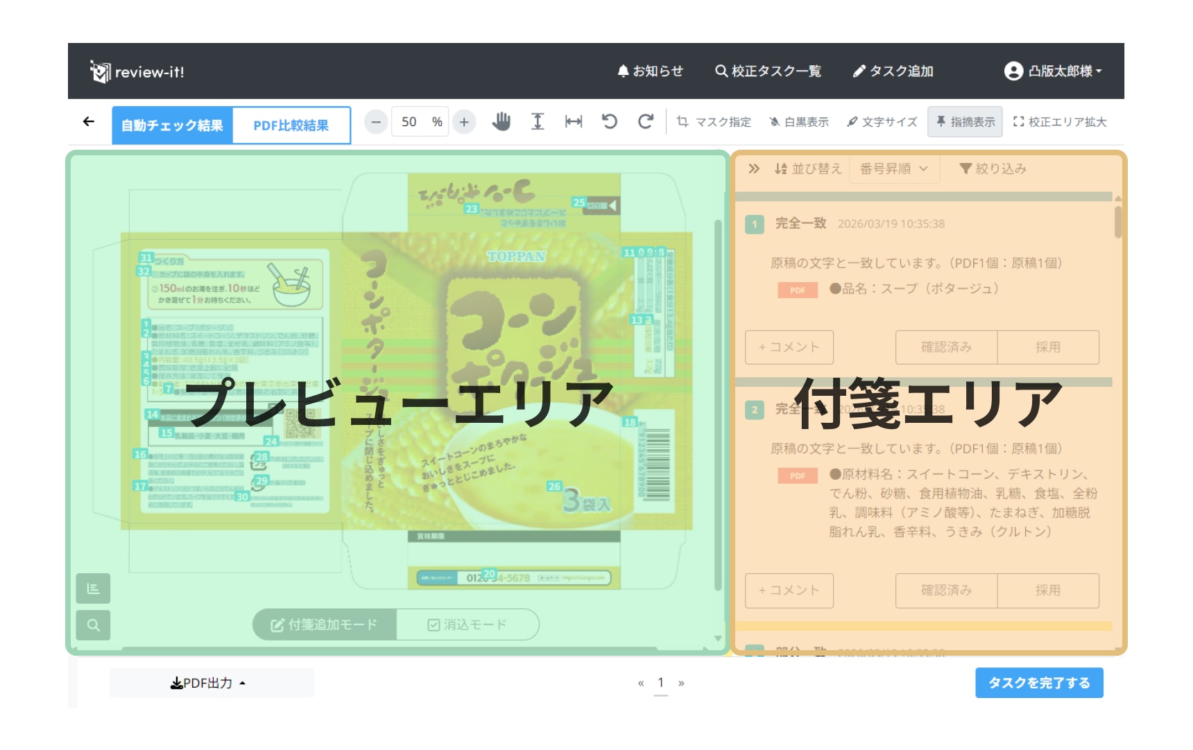 校正画面は、プレビューエリアと、指摘内容が表示される付箋エリアに分かれています。