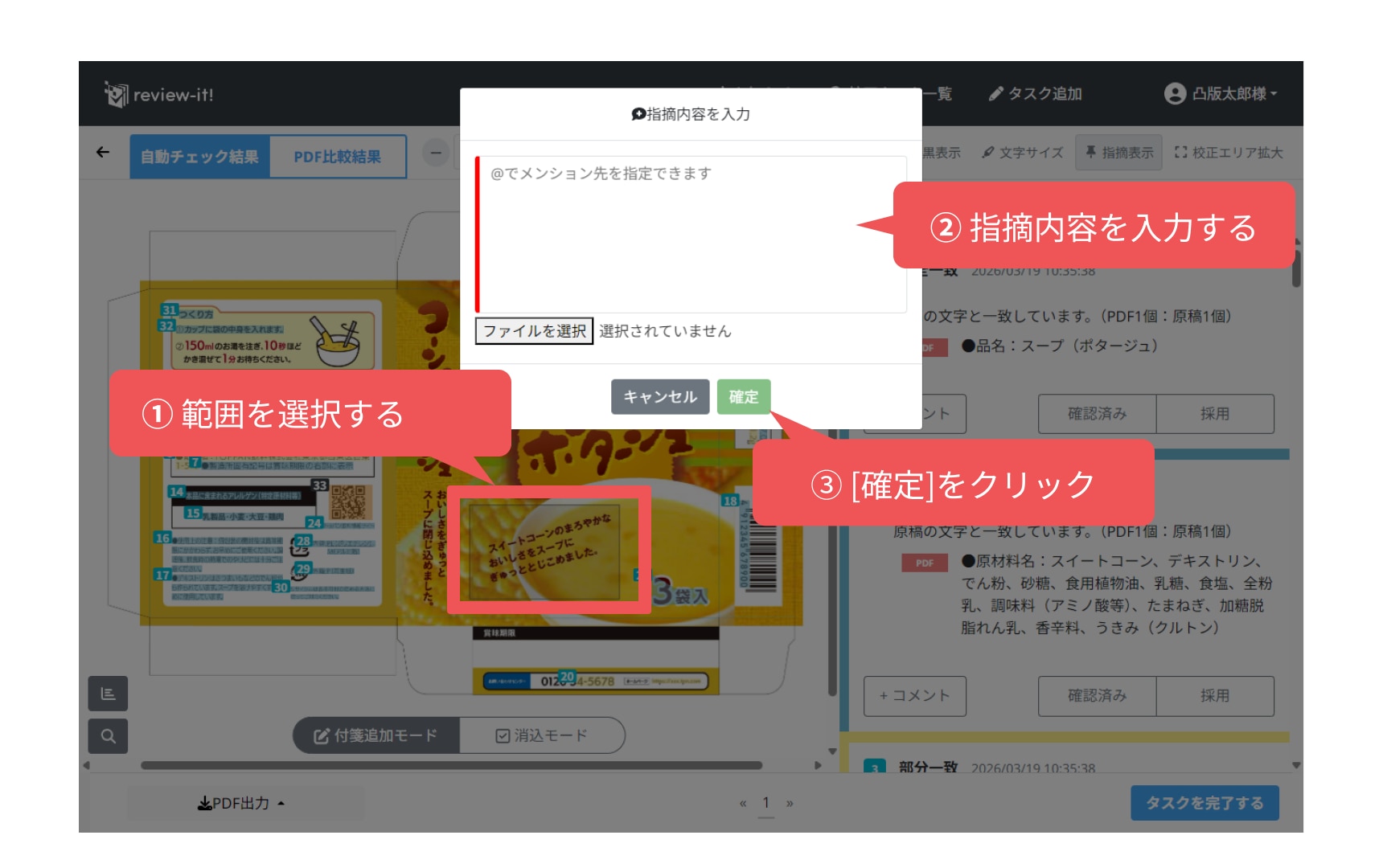 PDF上の任意の箇所をドラッグで範囲選択することで、指摘を入れることができます。