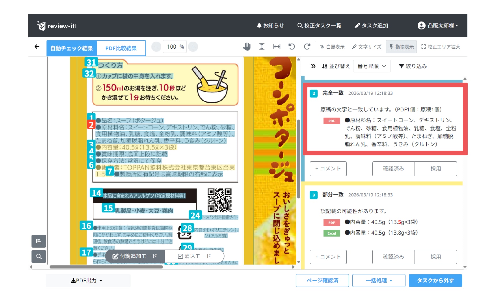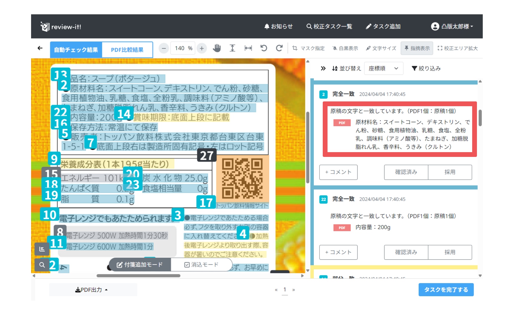 自動チェック結果画面での表示