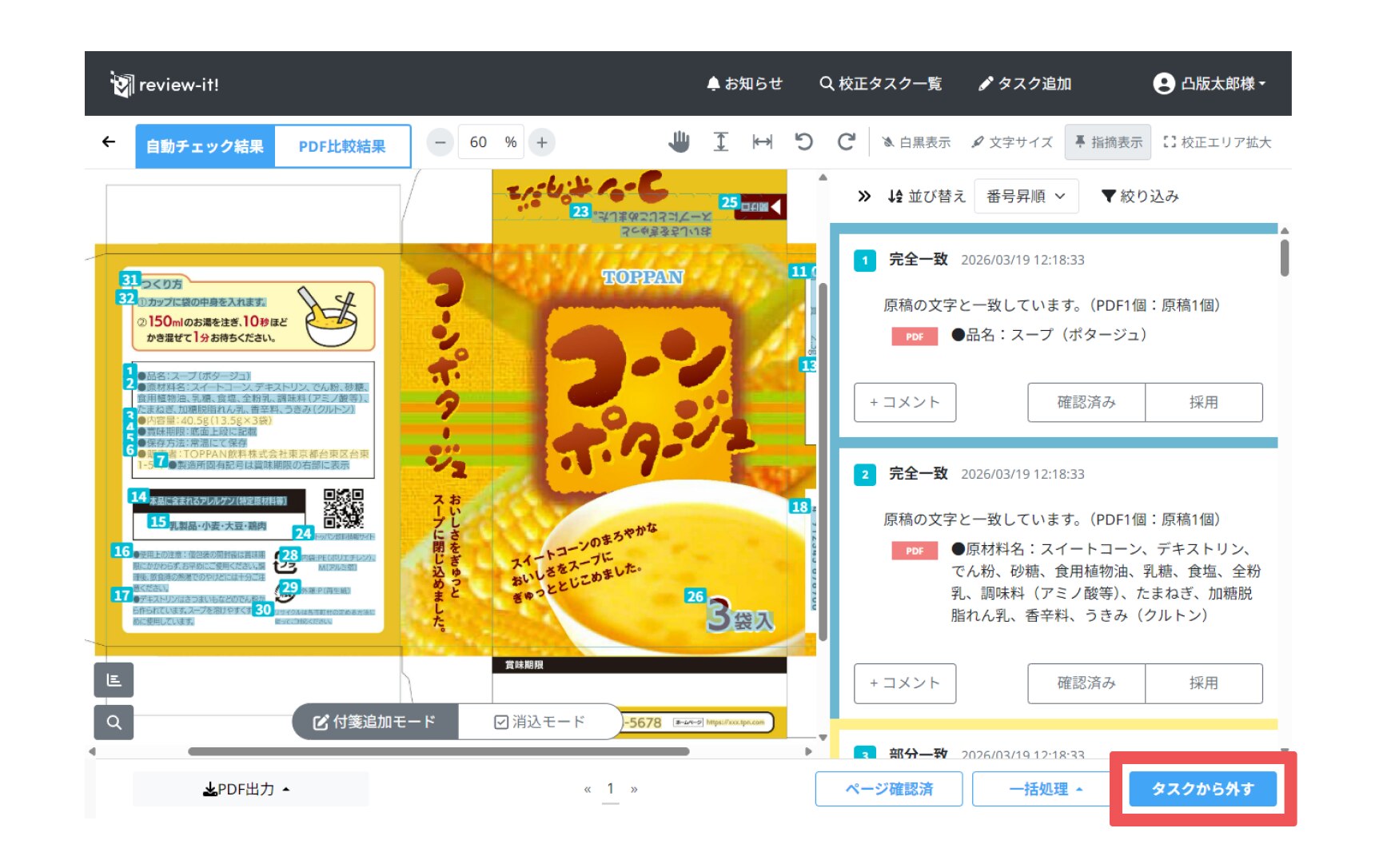 解除したいタスクの校正画面を開くと、画面左下に「タスクから外す」ボタンが表示されるのでボタンを押すと共同確認者から解除することができます。