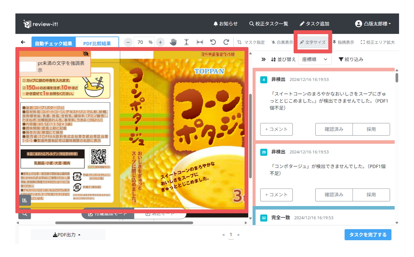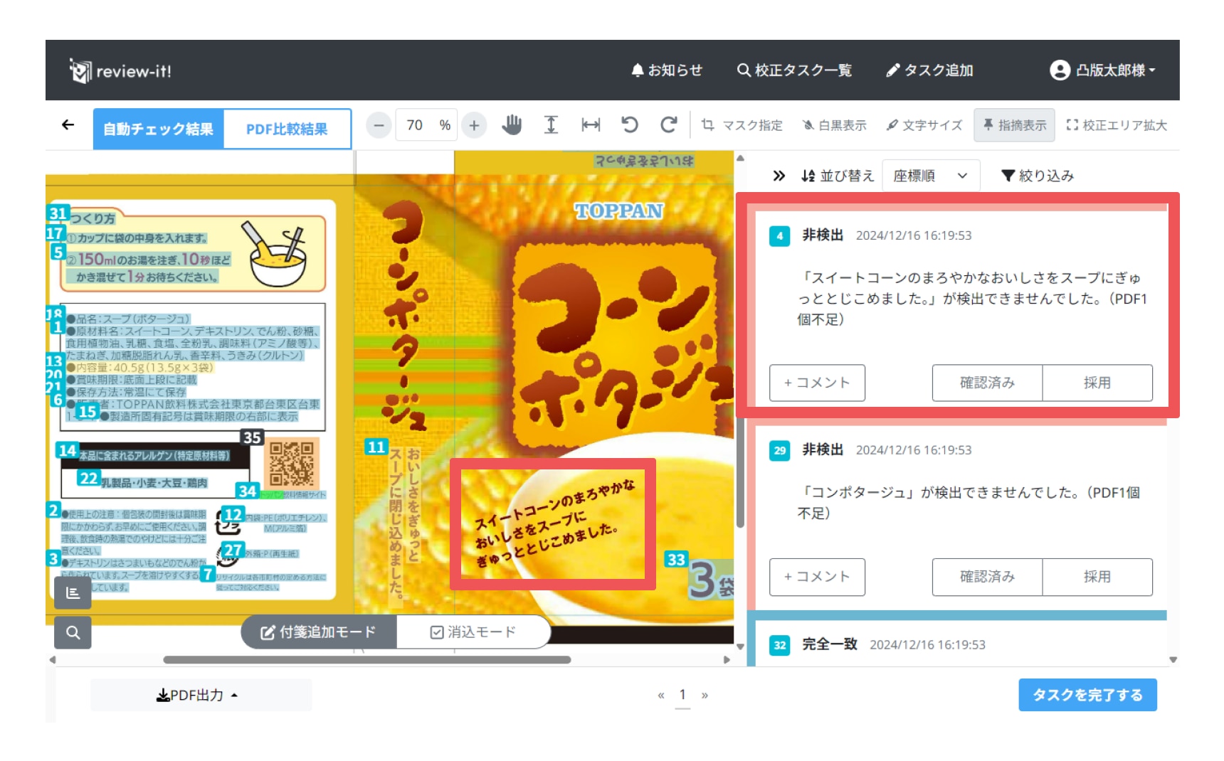 (例)画像内4番の付箋に記載されている「スイートコーンのまろやかなおいしさをスープにぎゅっととじこめました。」はPDF上に存在しているが「非検出」アラートになっている