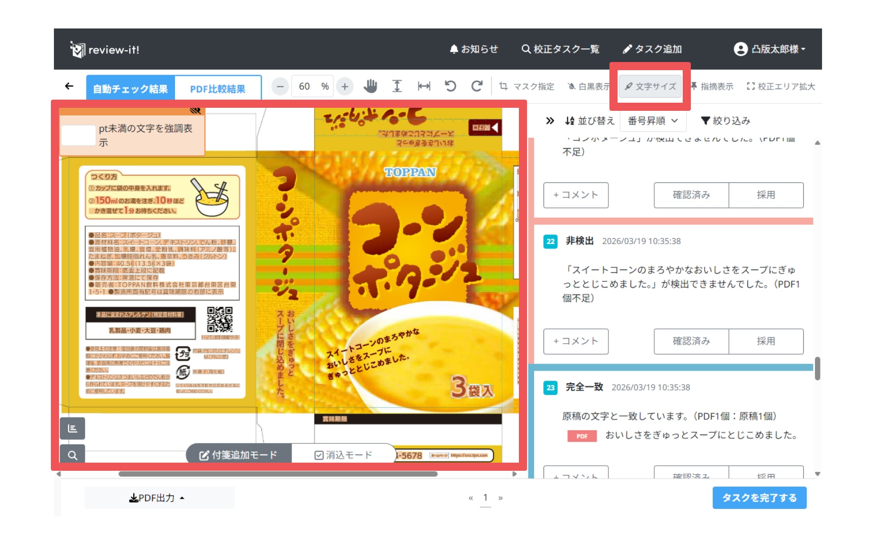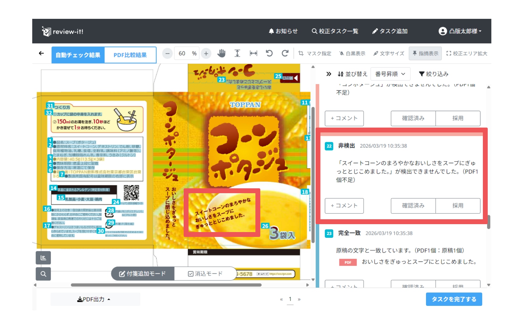 (例)画像内22番の付箋に記載されている「スイートコーンのまろやかなおいしさをスープにぎゅっととじこめました。」はPDF上に存在しているが「非検出」アラートになっている