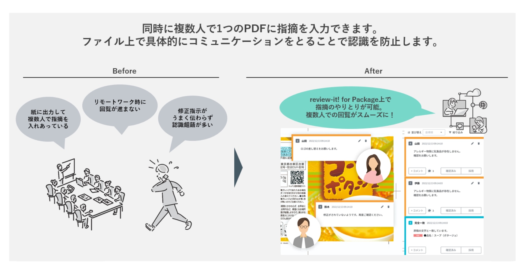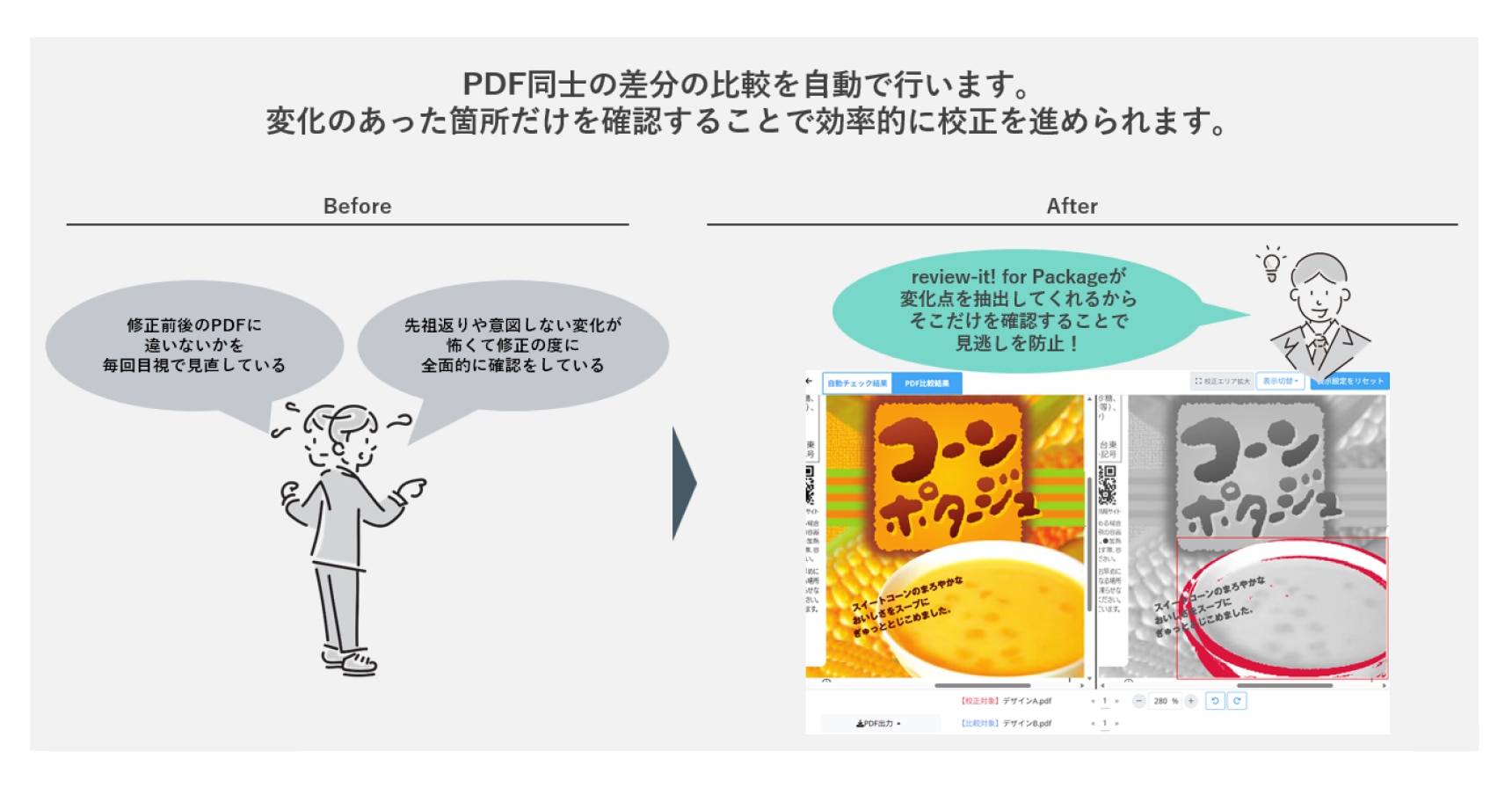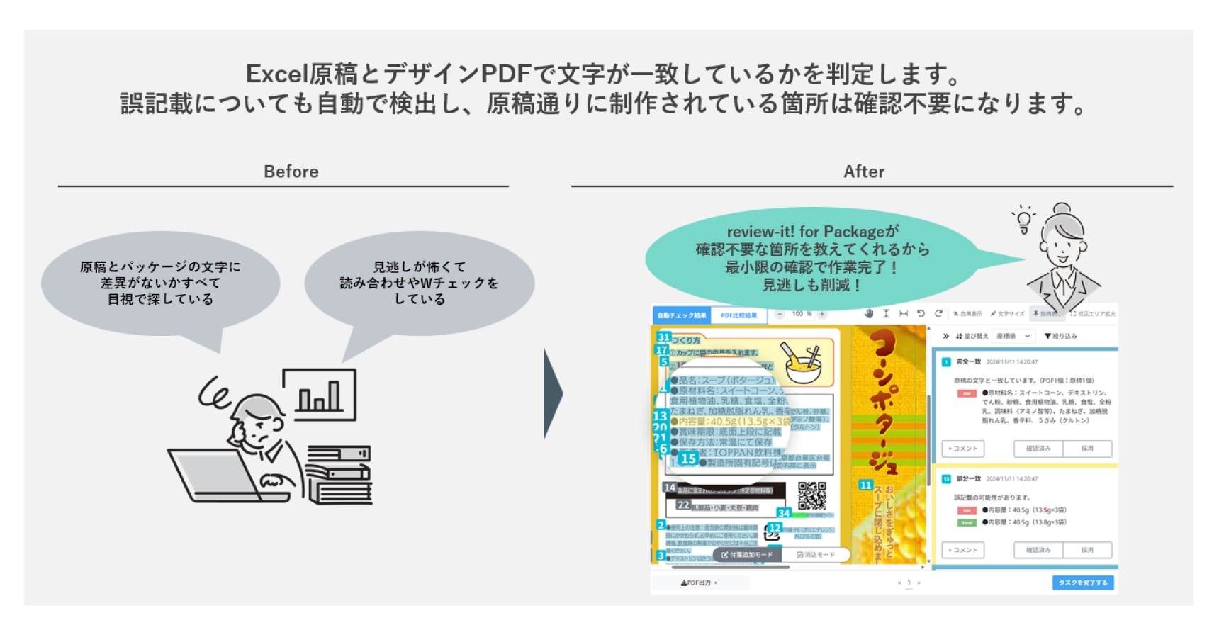 review-it! for Package は、お客様の食品や医薬品などのパッケージ校正を支援するサービスです。